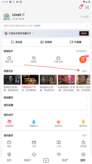 2、进入我的页面内,在观看历史的右侧点击全部的按钮。