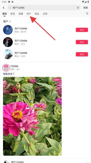 3、搜索结果出来后,点击用户进行切换标签。
