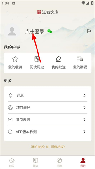 1、在江右文库首页,点击底部的我的选项,进入个人中心页面。