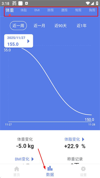 2、支持体重、体脂等多维度数据记录,通过图表呈现近一周/月等周期的变化趋势。