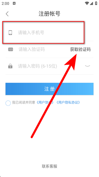 3、在注册帐号页面,输入手机号,点击获取验证码。