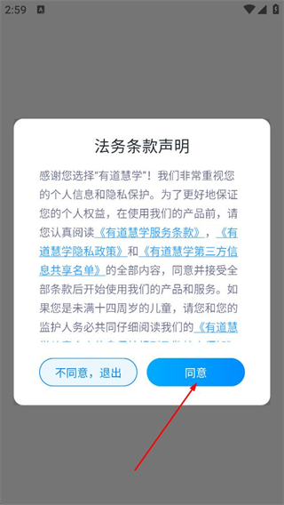 1、在APP的法务条款声明弹窗中,点击同意,进入登录页面。