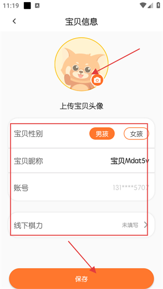 3、修改宝贝头像、性别、昵称、线下棋力等信息,点击保存。