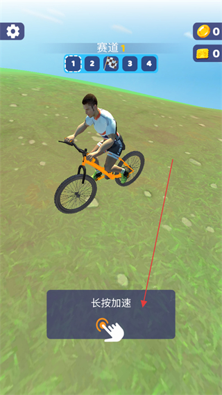 1、长按加速按钮,控制自行车在草地赛道上加速行驶,开启比赛。