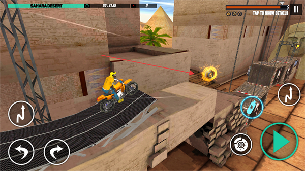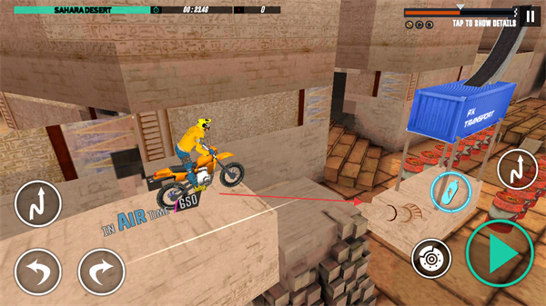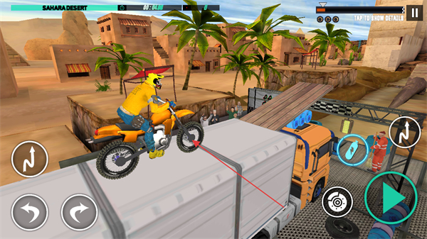 1、驾驶摩托车在沙漠场景的复杂赛道行驶,利用左右转向和加速按钮,在卡车、建筑间穿梭,挑战高难度地形。