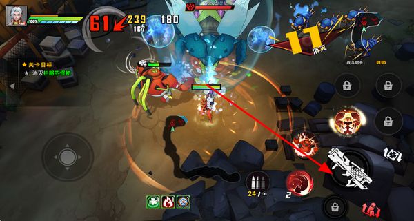 4、根据关卡目标,玩家点击攻击和技能按钮对拦路的怪物发起攻击,消灭目标怪物,完成关卡任务。