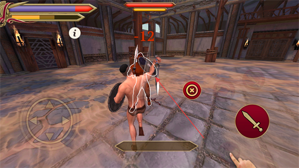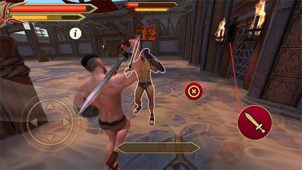 2、操控角斗士移动,点击右侧剑形按钮发起攻击,削减对手血量。