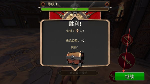 4、击败所有对手后,看到胜利!提示,点击继续结算奖励,推进游戏。
