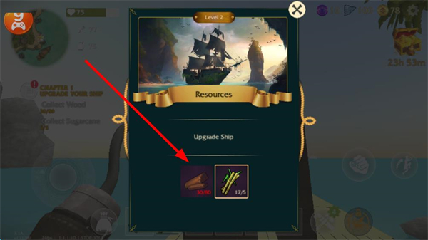 2、查看升级资源要求,进入船只升级界面后,能看到当前所需木材与甘蔗的数量,以此规划采集方向。
