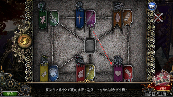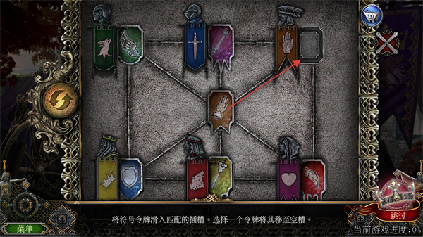 3、继续匹配剩余令牌,如将手符号令牌移至右上角空槽,逐步填满所有插槽。