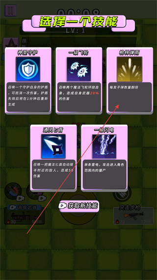 1、升级时选择技能如森林馈赠,增强攻击能力,提升战力。