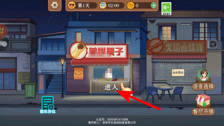 1、进入游戏后,点击煎饼果子店铺的进入按钮,开始经营店铺。