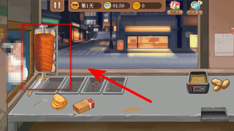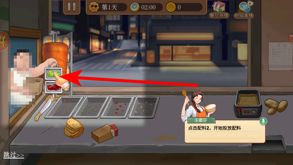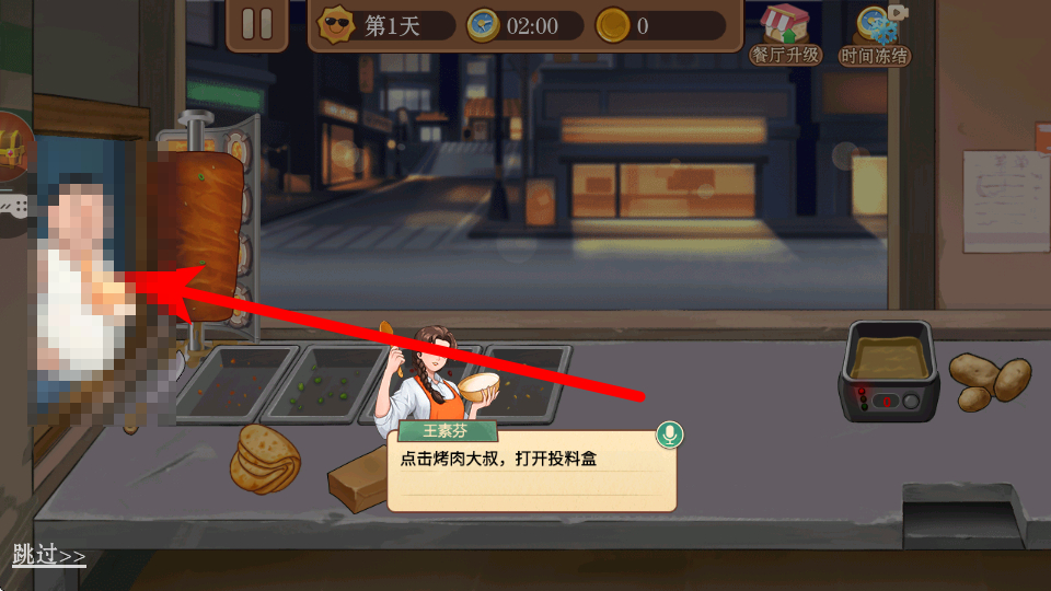 2、在店铺内,按照提示点击烤肉大叔,打开投料盒。