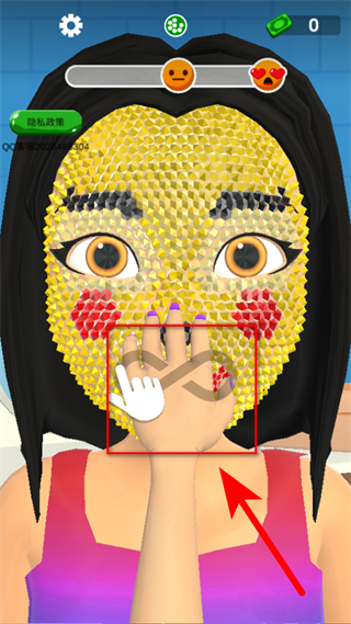 2、在游戏页面,按照提示用手操作去除脸部的装饰,逐步完成脸部整理。