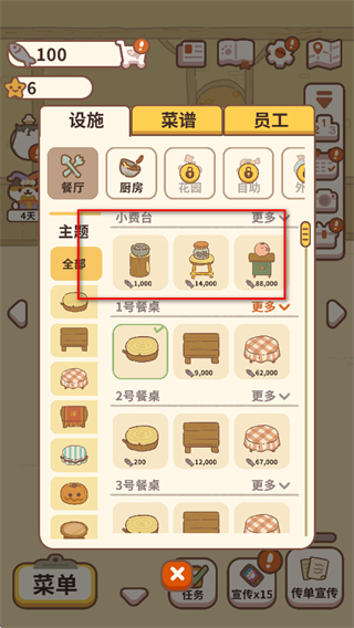 4、在菜单的设施界面,可根据金币情况选择解锁或升级小费台、餐桌等设施,提升餐厅经营能力。