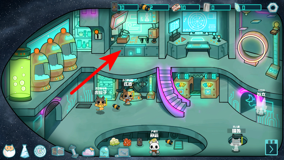 2、进入飞船场景后,点击造蛋的设备区域,进入造蛋界面,此操作是创建专属卵生猫的关键步骤,通过与飞船内的设备交互,可开启基因部件选择等造蛋环节。