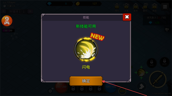 4、升级后解锁新技能闪电,点击确定按钮习得技能,增强战斗能力,继续挑战更高难度敌人。