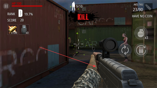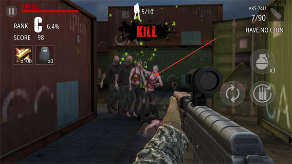 1、使用枪械瞄准僵尸射击,消灭僵尸积累击杀数和分数。