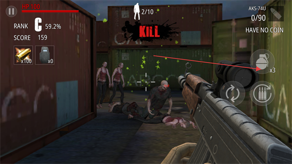 4、在弹药不足或僵尸密集时,使用手雷技能,对僵尸群造成范围伤害。