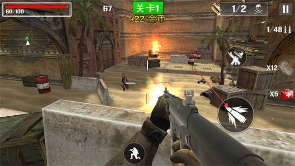 2、消灭敌人后获取金币奖励,切换武器如步枪提升火力,持续打击剩余敌人。
