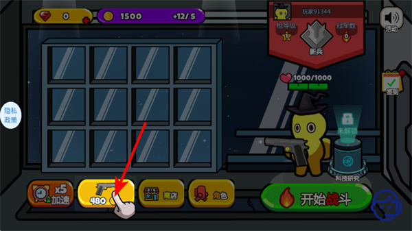 1、点击红色箭头指向的武器图标如手枪,消耗资源解锁该武器,这是获取战斗装备的关键操作。