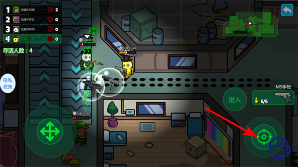 3、紧跟红色箭头指引,点击右侧瞄准按钮锁定敌方目标,再发起攻击击败敌人、减少自身损伤策略。