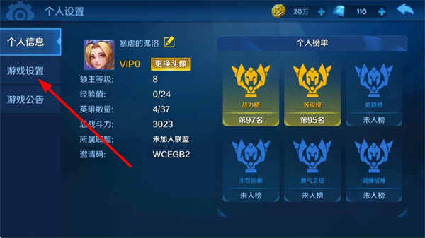 1、点击游戏主界面左上角的个人头像,进入个人设置界面。