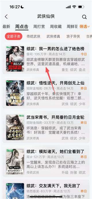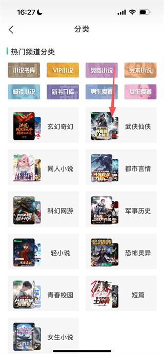 2、在分类页面,选择武侠仙侠分类,进入对应小说列表页面。