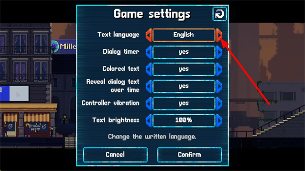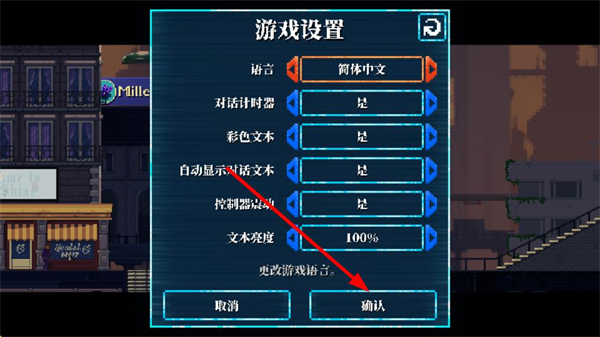 3、在游戏设置页面里,找到Text language对应的选项,点击其后方的三角按钮,将语言切换为简体中文,