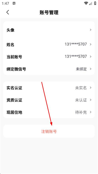 4、在账号管理页面点击注销账号,进入注销账号页面。