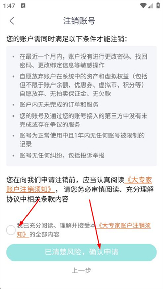 6、勾选协议,点击已清楚风险,确认申请,完成账号注销。