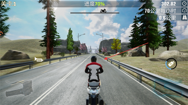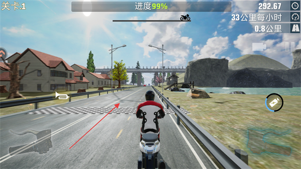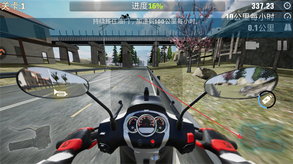 1、操控摩托时,持续按住油门键加速,目标是将速度提升到100公里/小时,推进关卡进度。