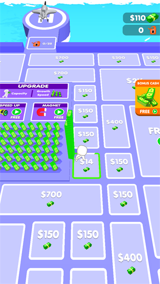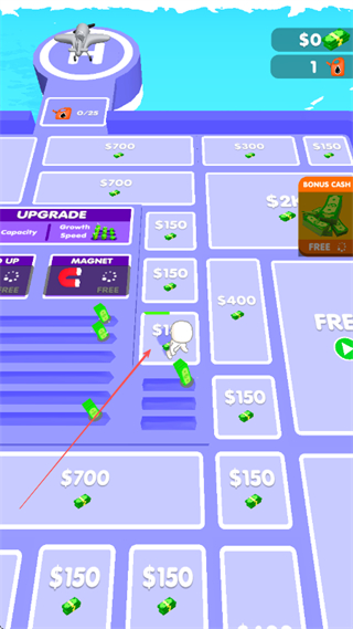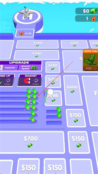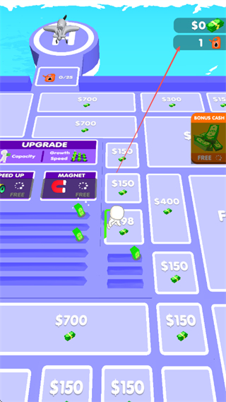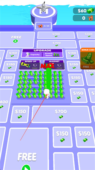 1、在场地中操控角色收集绿色金钱堆,可点UPGRADE提升Capacity等属性,积累金钱。
