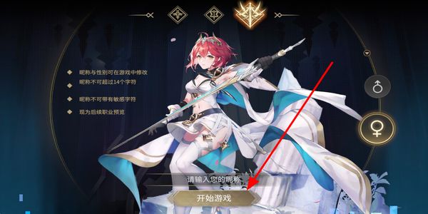1、创建界面输入符合要求的昵称,选择性别后点击开始游戏,完成角色创建并进入游戏流程。