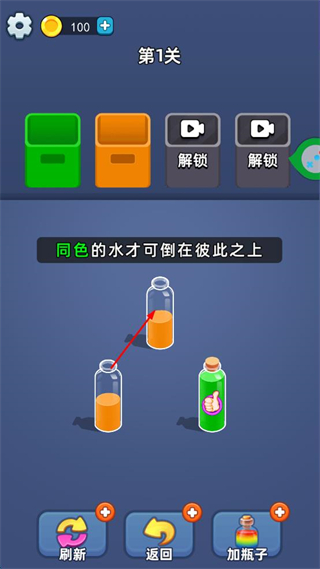 1、点击装有少量橙色液体和绿色液体的瓶子,将其液体倒入对应颜色的容器相关瓶子中,完成该瓶子的初步倒液操作。