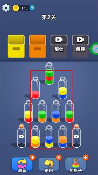 3、观察界面中瓶子的液体颜色,继续将同色液体的瓶子进行倾倒操作,让相同颜色的液体汇聚在同一容器类瓶子里。