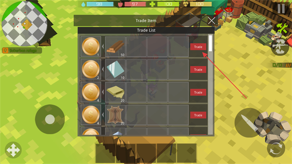 2、在交易列表中点击Trade,用金币兑换道具如木材、布料等。