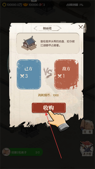 2、在弹窗中点击收购按钮,消耗铜钱获取敌方资源。