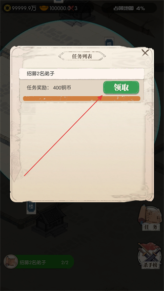 4、打开任务列表,点击领取按钮,获取招募弟子对应的铜钱奖励。