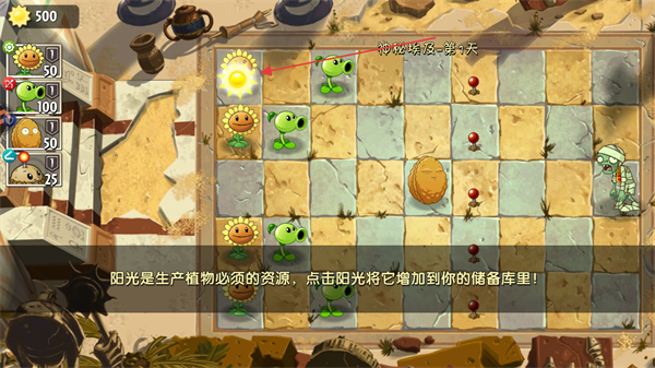 2、点击阳光收集资源,用阳光种植植物,作为生产植物的必备资源。