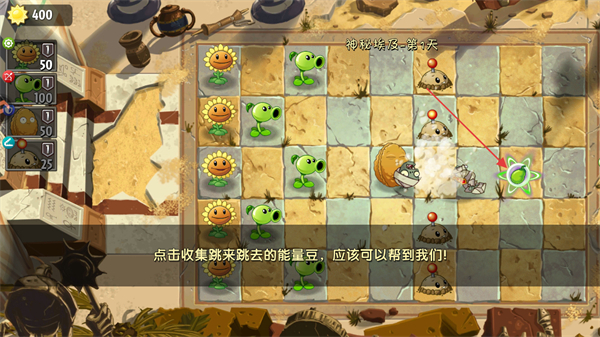 3、点击收集能量豆,借助其效果助力战斗,抵御敌方僵尸进攻。