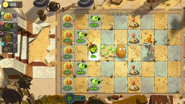 4、种植豌豆射手等植物,发动攻击击退僵尸,推进关卡进度。