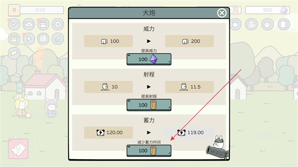 2、打开大炮界面,花费资源提升蓄力等属性,增强大炮能力。
