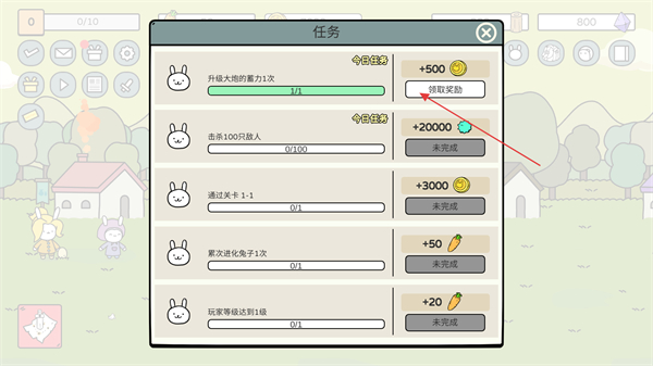4、返回任务界面,点击领取奖励,获取升级大炮的蓄力1次的奖励。