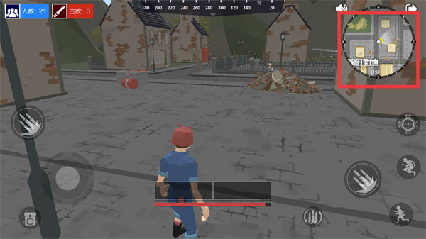 2、进入游戏对局场景,通过右上角小地图查看当前区域,操控角色在小镇场景中移动,留意剩余人数与击败数状态。