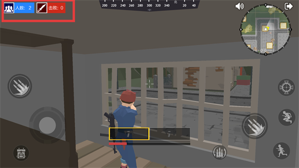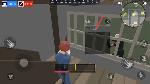 3、在场景中获取【UZI】武器后,瞄准窗外的敌人,准备进行攻击操作,推进对局进程。