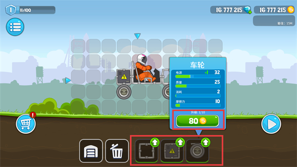 1、可消耗金币升级【车轮】,提升其【电源】【质量】【消耗】等属性,通过底部升级按钮强化载具性能。