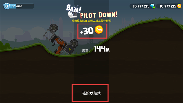 4、游戏结束后会获得金币奖励,点击【轻按以继续】即可继续完成游戏挑战。