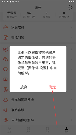 2、进入账号的界面内,向下拉动找到并点击申请摄像机解绑的按钮。