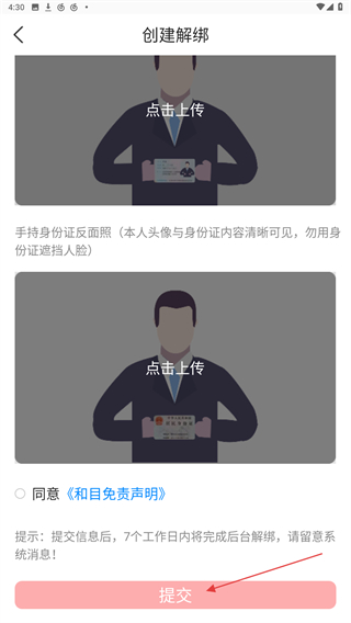 4、进入创建解绑的页面内,上传相关内容后点击最下方提交的按钮。